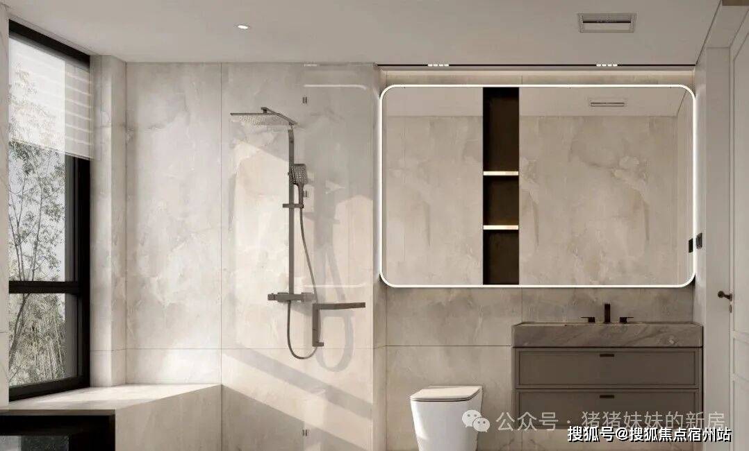 配备美妆龙头,大容量镜柜可收纳洗漱用品,利用墙面空间设置壁龛,便于存放毛巾、衣物便于取用。